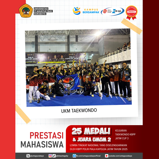 SELAMAT & SUKSES. Mahasiswa Universitas 17 Agustus 1945 Surabaya kembali memperoleh prestasi tingkat Nasional hasil dari KEJUARAN NASIONAL TAEKWONDO KBPP JATIM CUP 3 yang di laksanakan pada 5-7 Desember 2025 di ITS Robotic Center Surabaya. Adapun medali yang berhasil diraih, yakni JUARA UMUM (2 medali), 15 medali emas, 9 medali perak, serta 1 medali perunggu.