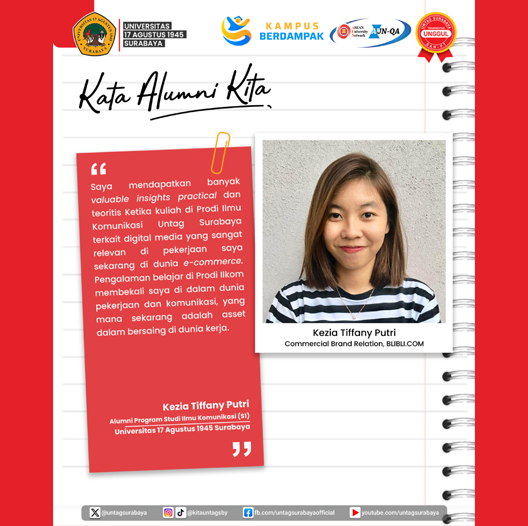 "Saya mendapatkan banyak valuable insights practical dan teoritis Ketika kuliah di Prodi Ilmu Komunikasi Untag Surabaya terkait digital media yang sangat relevan di saya pekerjaan sekarang di dunia e-commerce. Pengalaman belajar di Prodi Ilkom membekali saya di dalam dunia pekerjaan dan komunikasi, yang mana sekarang adalah asset dalam bersaing di dunia kerja."